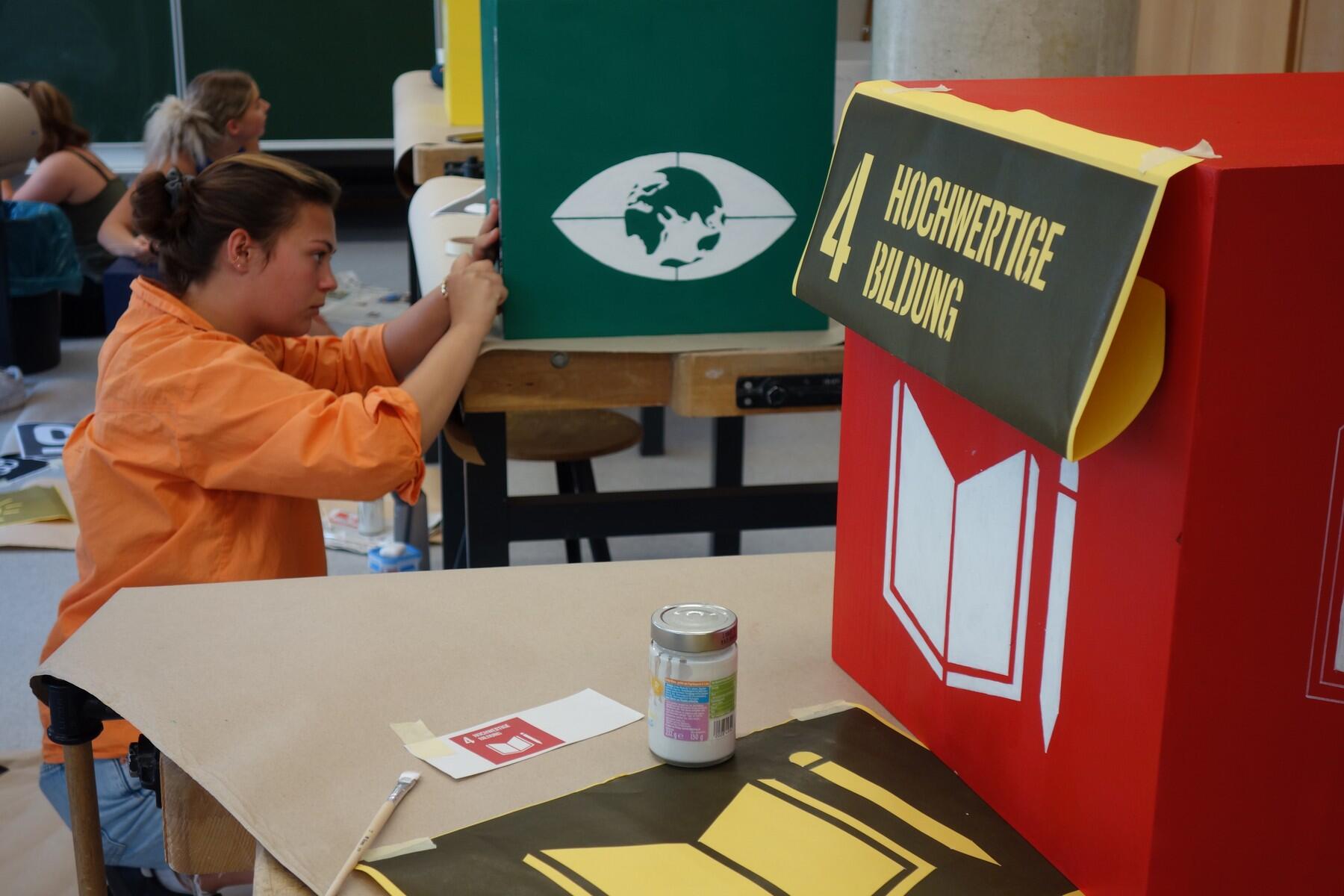 Jeder der 17 bunt bemalten, von einem Schreiner aus dem Landkreis aus heimischer Fichte hergestellten Würfel steht für ein Ziel der Nachhaltigkeit der Agenda 2030. Die FOSBOS Neuburg nimmt das Streben nach einer lebenswerten Welt ernst: Die Würde des Menschen respektieren, Wohlstand und starke Partnerschaften fördern, sich um das Wohl der Erde und um Frieden und Gerechtigkeit sorgen – all das lässt sich tatsächlich auch an einer Schule umsetzen. Mit jedem der 17 Sitzwürfel stehen auch konkrete Aktionen an der Schule in Verbindung: Die FOSBOS macht nicht nur regelmäßig Blutspendeaktionen, ist Fair Trade-Schule und hat seit Jahren ein Patenkind in Tansania. Die Liste der Aktionen und Schulprojekte, die sich mit dem Thema befassen, ist lang.