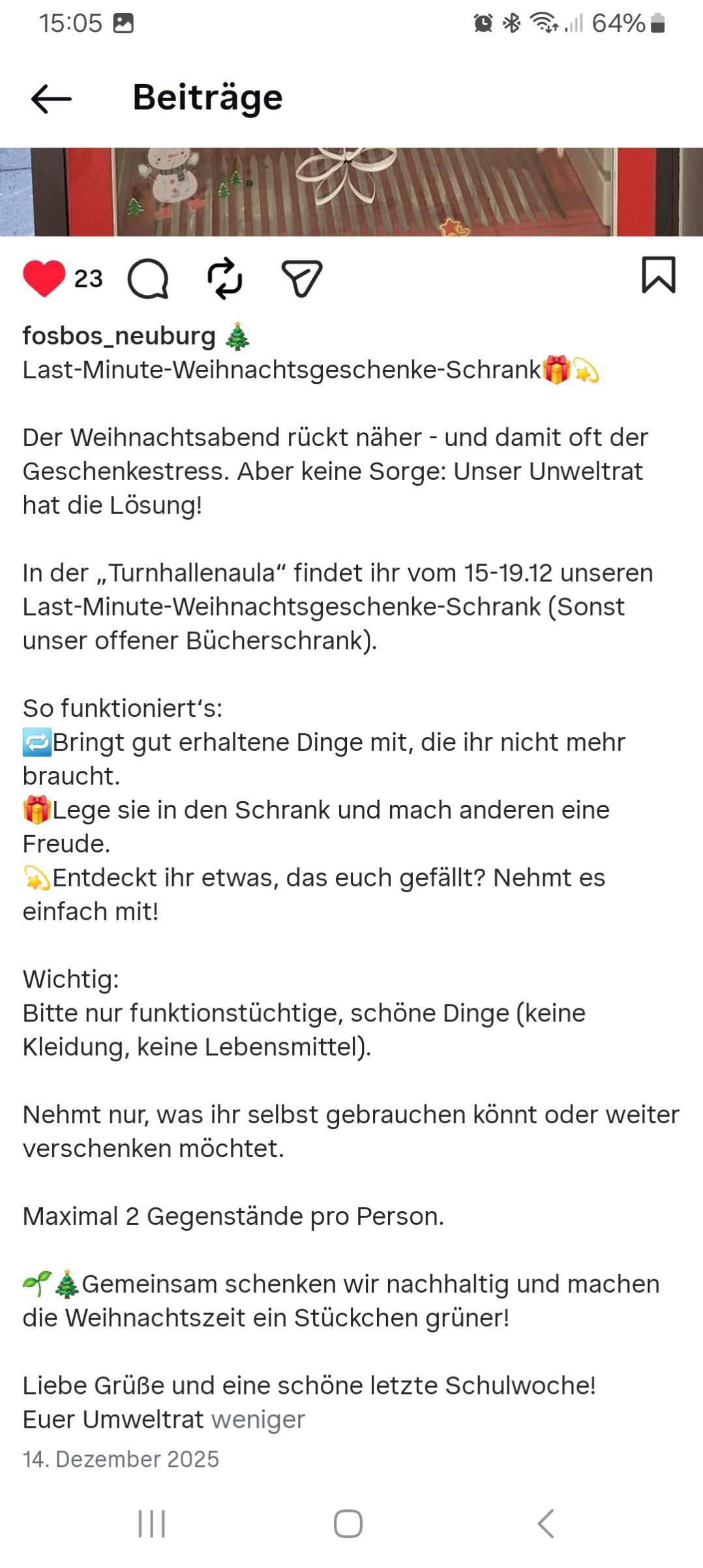 Ein kreativer Impuls im Dezember 2025 war an der FOSBOS Neuburg die Wiederbelebung des schulinternen Bücherschranks. Neben dem klassischen Austausch von Büchern wurde er in der letzten Schulwoche vor den Weihnachtsferien auch als „Last-Minute-Geschenkeschrank“ genutzt – eine nachhaltige Möglichkeit, anderen spontan eine Freude zu bereiten und gleichzeitig das eigene Konsumverhalten zu reflektieren.