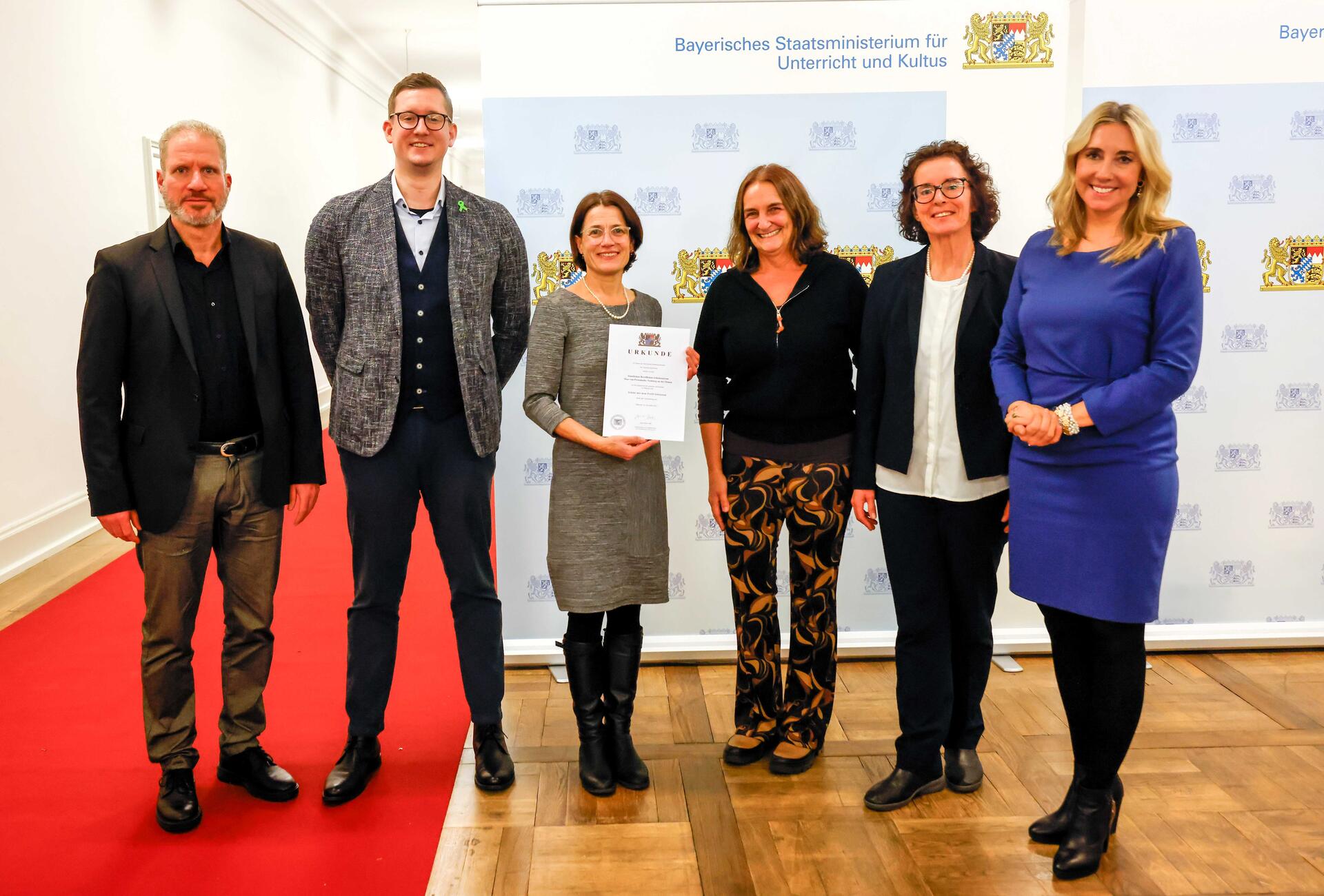 Dr. Jens Müller (Mitarbeiter MB-Ost) – Benjamin Wipfler (Profilkoordinator FOSBOS Neuburg) – Dr. Eva Hertle (Schulleiterin BSZ Neuburg) – Christine Voglgsang (Regens-Wagner-Berufsschule Schrobenhausen) – Martina Wenzel (FOSBOS Neuburg, Weitere Ständige Vertreterin der Schulleiterin) – Anna Stolz (Bayerische Staatsministerin für Unterricht und Kultus)